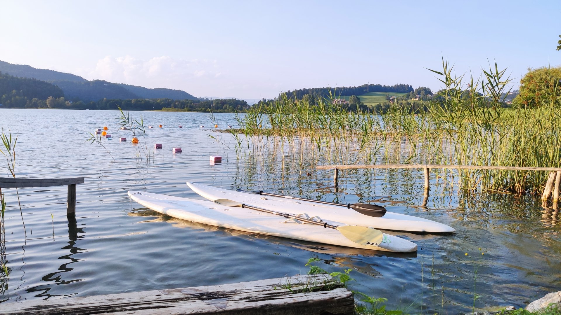 Ein paar Stunden später unternahmen Lilo und ich (Kaja) noch eine Tour, in der Abendsonne, auf dem See mit zwei Surfbrettern, die wir als Stand-up-paddling-Bretter benutzten.